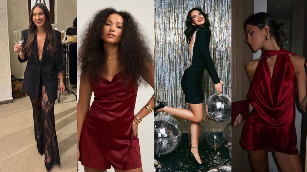 O preto retorna com força, especialmente em tecidos leves, transparências e recortes precisos. Longe de carregar mau agouro, ele comunica sofisticação, autonomia e desapego de simbolismos prontos. Já os vermelhos profundos, vinhos e tons cereja aparecem como tradução de desejo, presença e vitalidade — sentimentos tão legítimos para uma virada quanto a tal “paz”.
